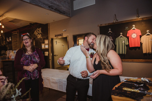 Friends, this past weekend was the last big wedding of the season for me, and it ended with a bang! Ashley and Chris got married at the courthouse on Halloween in a super private ceremony with them and their three kiddos. However... they still wanted to celebrate with everyone! So this past Saturday, on November 4th, they had the most gorgeous wedding reception! The evening, hosted by Compass Rose Brewery, was an intimate gathering of friends and family. The space was decorated in black, gold, burgundy, and cranberry, with corks for the guests to write well wishes, a plate to sign instead of a guest book, and shots of Jack Daniels to take home as favors. The flowers, created by Brandi's Botanicals, were absolutely stunning, and fit the Halloween/Foraged Fall theme perfectly! The cake was created by Love Cake and was so insanely yummy, as well as gorgeous!